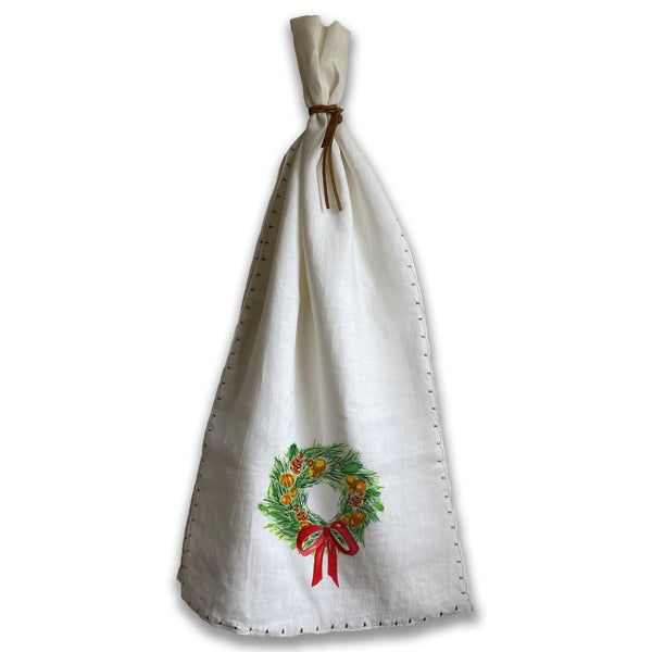 Hand-stitched linen table runner with contrasting stitching printed with hand painted artwork on both ends.