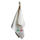 Hand-stitched linen tablecloth with contrasting stitching printed with hand painted artwork on each corner.