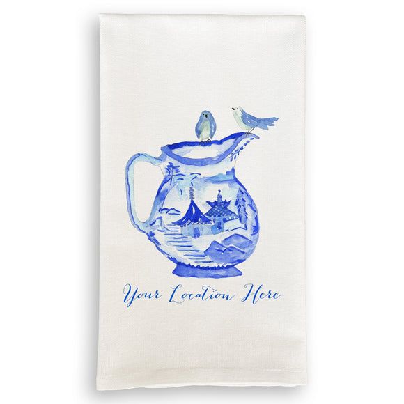 Blue & White Pitcher with Birds and Location