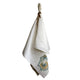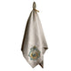 Hand-stitched linen tablecloth with contrasting stitching printed with hand painted artwork on each corner.